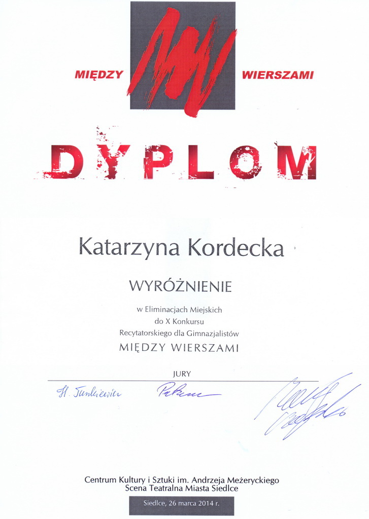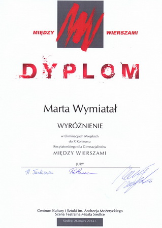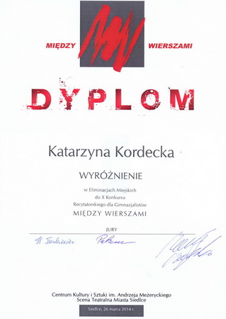 26 marca w Centrum Kultury i Sztuki im Andrzeja Meżeryckiego Scena Teatralna Miasta Siedlce odbył się X Konkurs Recytatorski dla Gimnazjalistów „Między wierszami”. Wzięły w nim udział 4 uczennice naszego gimnazjum. Wyróżnienia otrzymały: Marta Wymiatał kl. 3c i Katarzyna Kordecka kl. 1a. Uczennice zostały przygotowane przez panie polonistki – p. Magdalenę Olszewską – Silną i p. Małgorzatę Jaroszczyk.