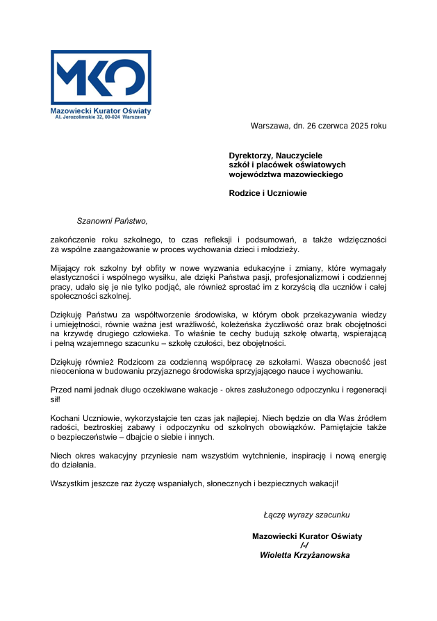 Aktualności List Mazowieckiej Kurator Oświaty z okazji zakończenia zajęć edukacyjnych w roku szkolnym 2024/2025 30 czerwca 202530 czerwca 2025 M.Bieluga