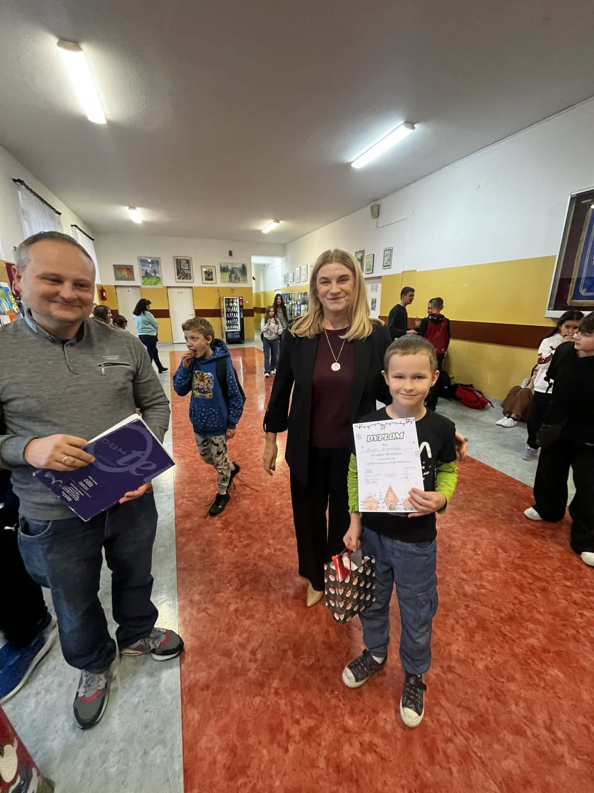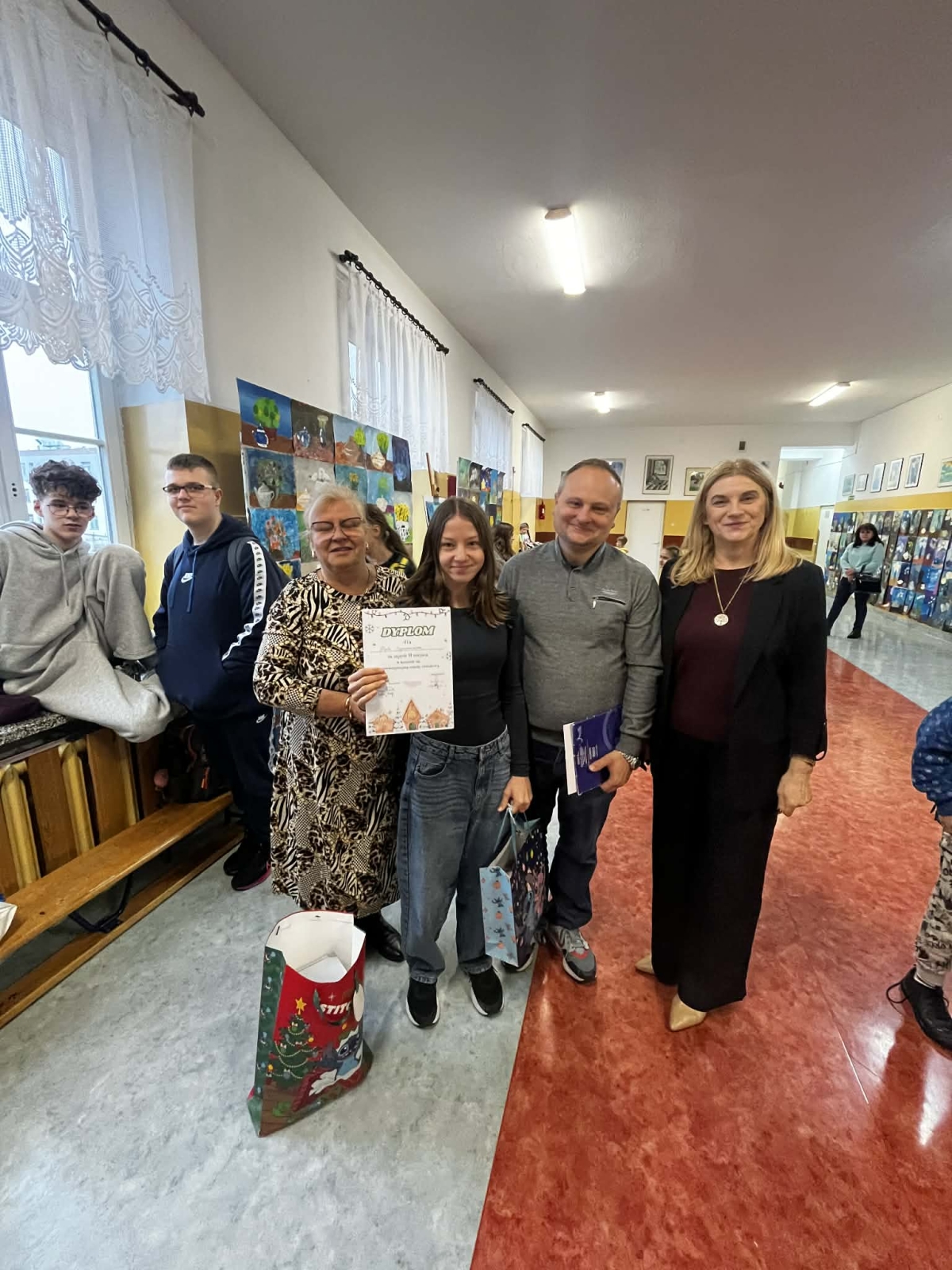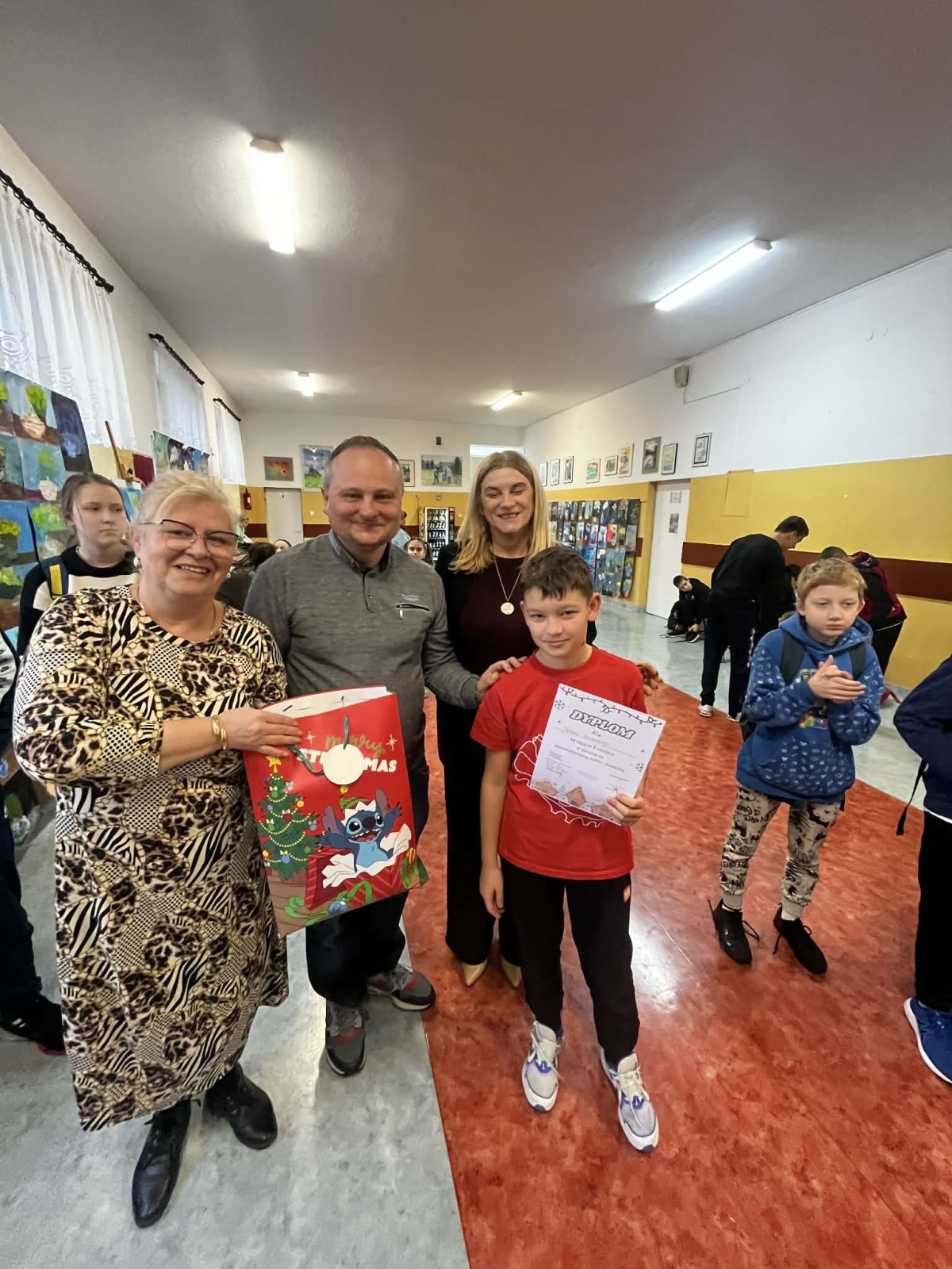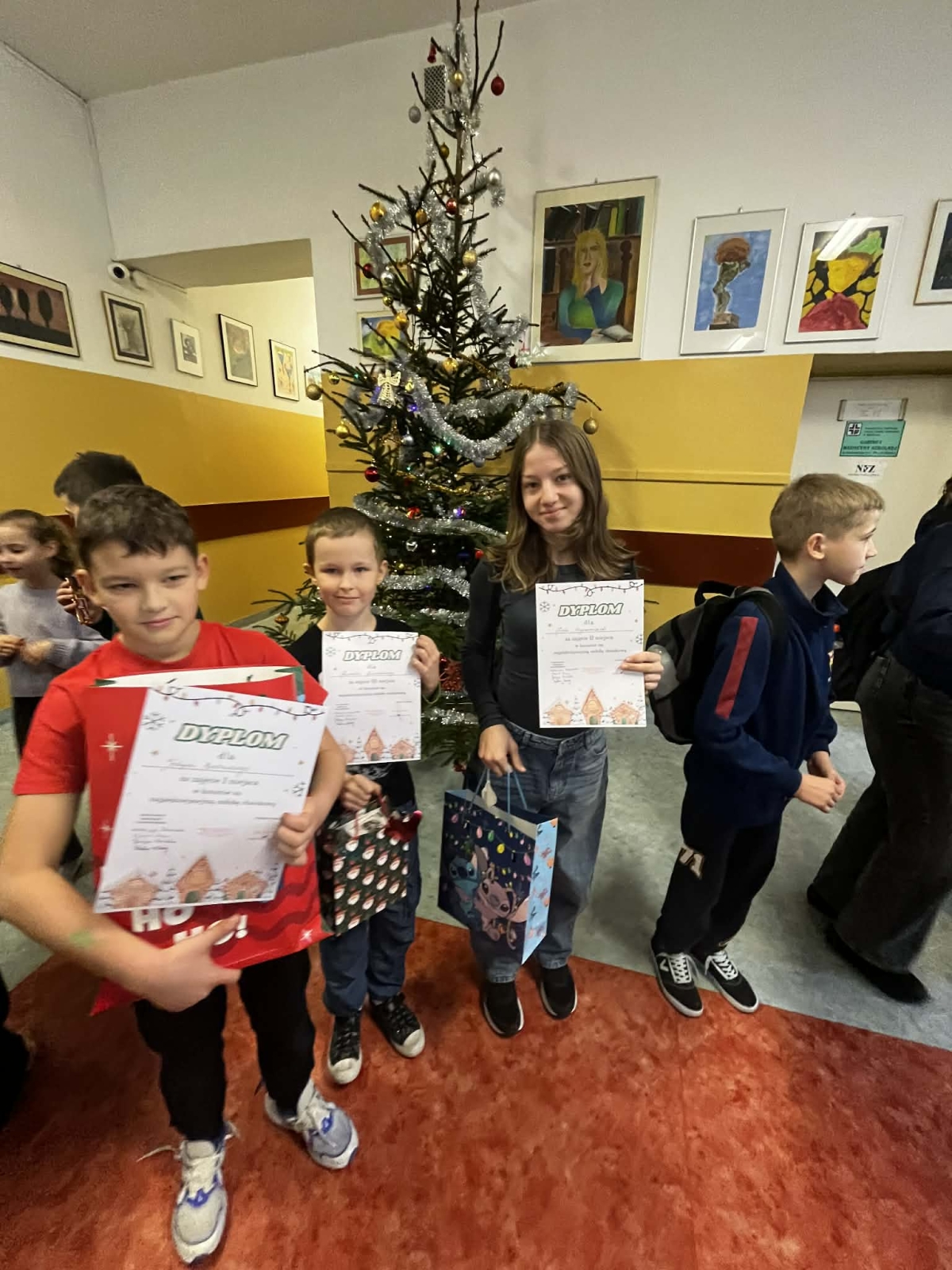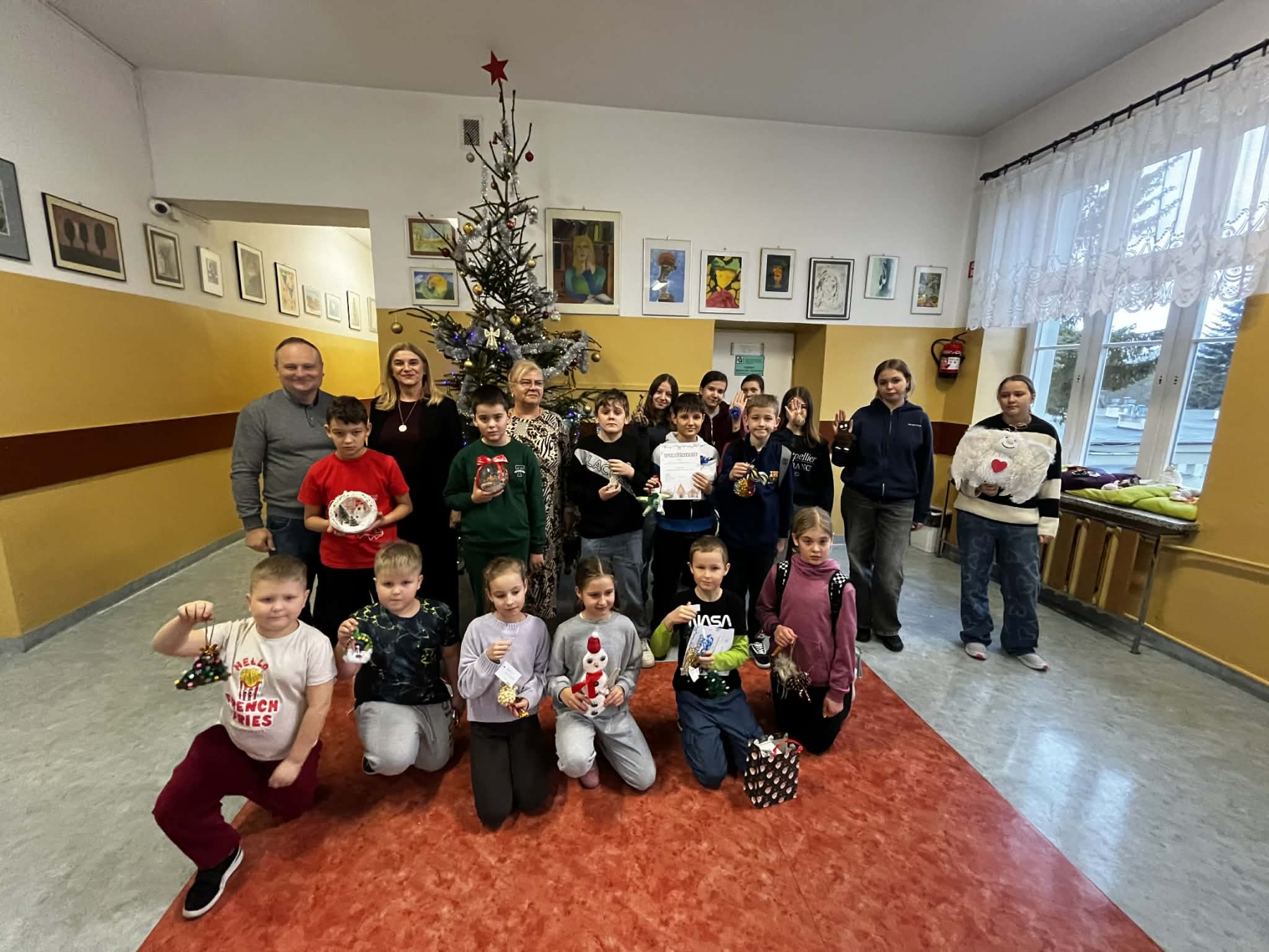 W piątek, 12 grudnia uczestnicy konkursu zebrali się na przerwie przy naszej szkolnej choince. Pani Dyrektor wręczyła nagrody i wyróżnienia, a pozostali uczniowie otrzymali drobne słodkości. Po wspólnym zdjęciu wszyscy zawieszali wykonane ozdoby.