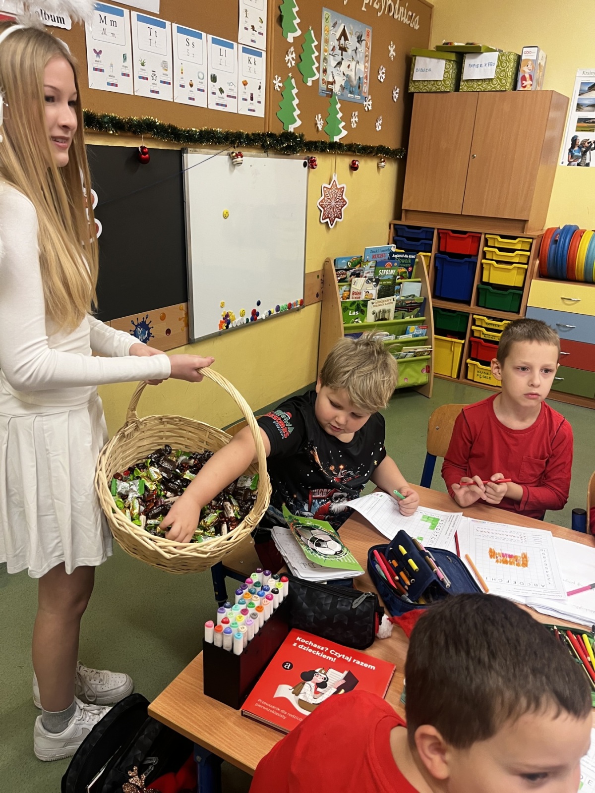 Z tej okazji uczniowie z klas 1-3 wzięli udział w akcji Samorządu Uczniowskiego i ubrali się w mikołajkowe stroje, a nauczyciele przygotowali wiele atrakcji i niespodzianek. Tego dnia, od samego rana Mikołaj częstował uczniów edukacji wczesnoszkolnej cukierkami oraz wręczał drobne upominki, które dostarczyły wiele radości.