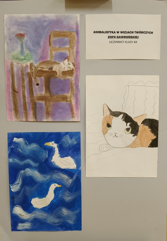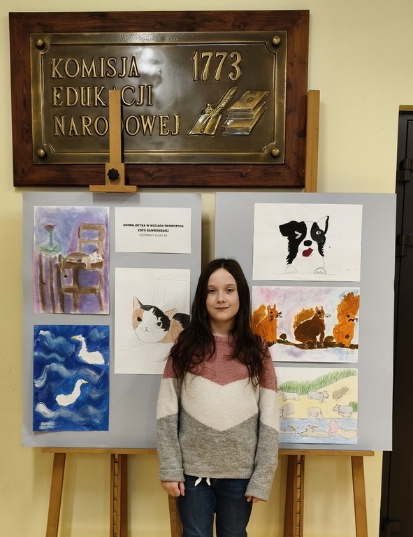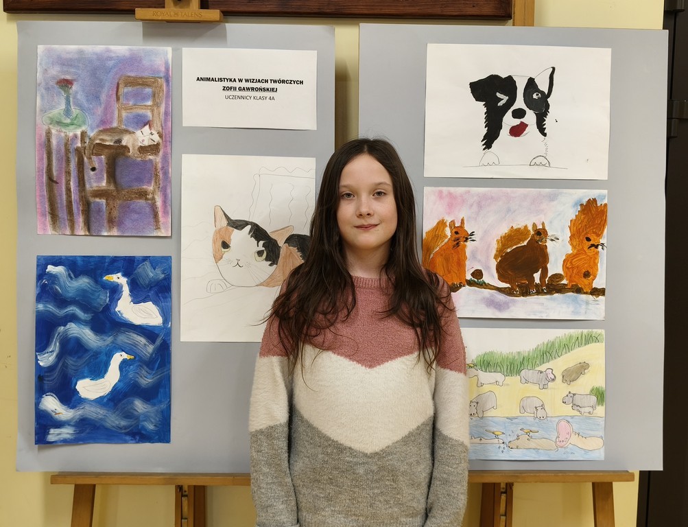 Nasza szkolna Strefa pasji i talentów powiększa się… Witamy Zosię Gawrońską , uczennicę klasy 4a! Ekspozycja obejmuje prace o tematyce animalistycznej tworzone pastelami oraz farbami. Młoda Artystka z dużą wrażliwością oddaje charakter zwierząt, śmiało nadaje kształt i barwę. Każda praca to dowód talentu oraz pasji tworzenia. Zapraszamy do galerii!