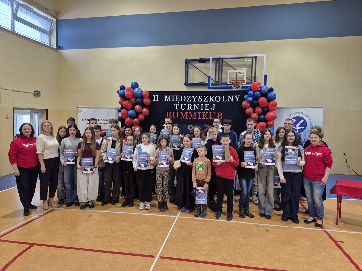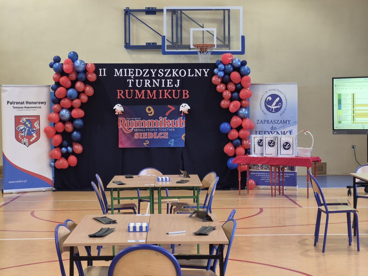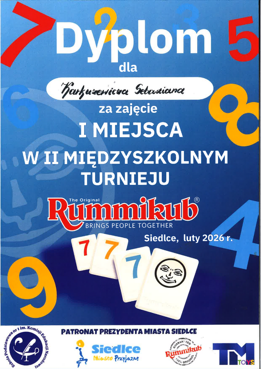 Dnia 18 lutego 2026 r. w Szkole Podstawowej nr 1 im. KEN odbył się II MIĘDZYSZKOLNY TURNIEJ RUMMIKUB. Wzięło w nim udział 30 uczniów, reprezentujących 10 szkół podstawowych z miasta Siedlce: SP1, SP2, SP3, SP4, SP5, SP7, SP8, SP9, SP10, SP12. Patronat honorowy nad Turniejem objął Prezydent Miasta Siedlce.