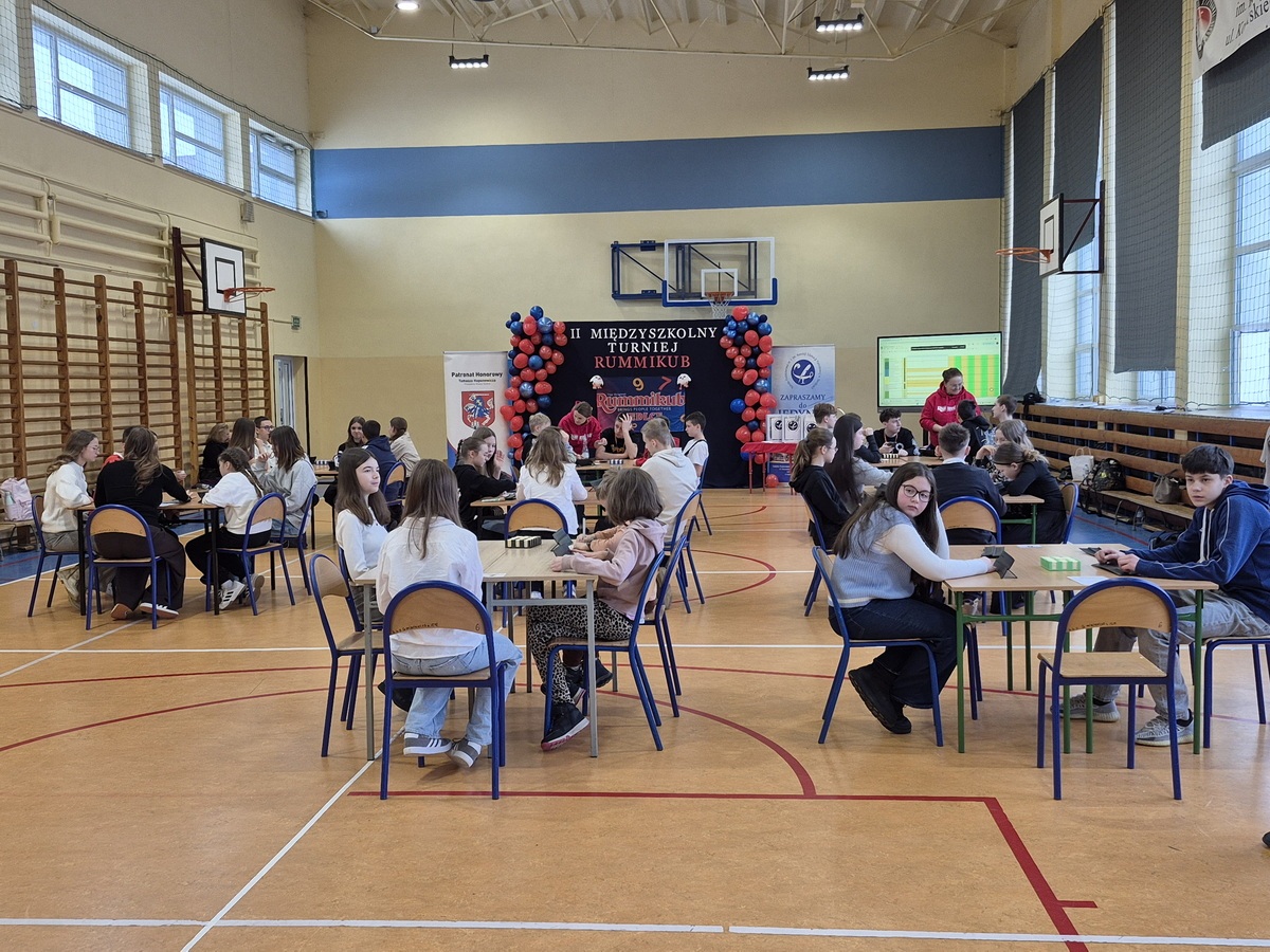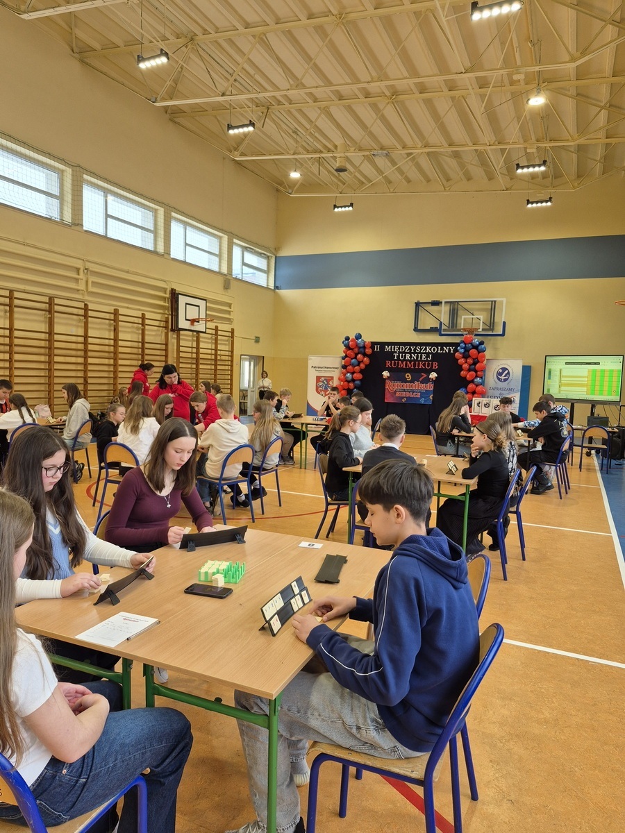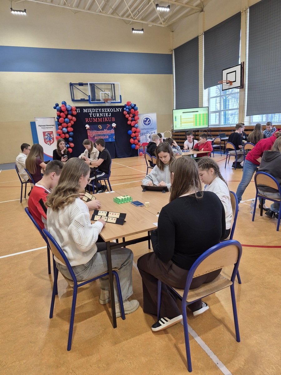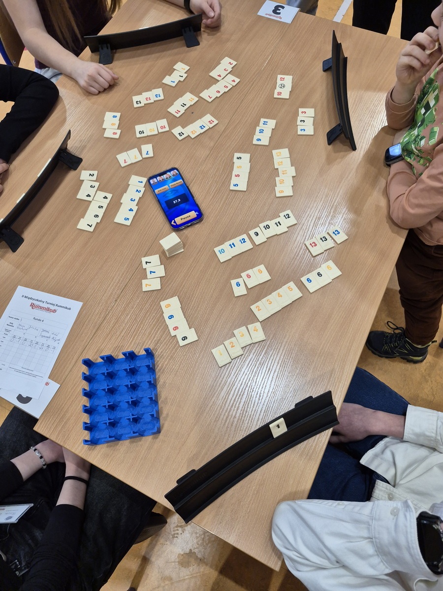 Po raz kolejny w naszej szkole odbyły się rozgrywki Rummikub – gra, która rozwija umiejętności matematyczne, logiczne myślenie, zapamiętywanie oraz jest okazją do poznania rówieśników z innych szkół. Kluczową zasadą gry jest możliwość manipulowania i modyfikowania już wyłożonych na stole układów, co wymaga logiki i planowania, a zwycięzcą zostaje ten, kto pierwszy pozbędzie się wszystkich płytek.