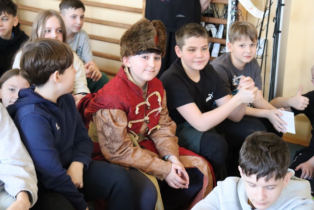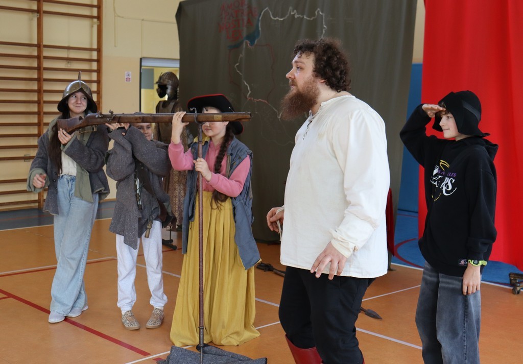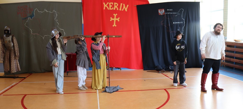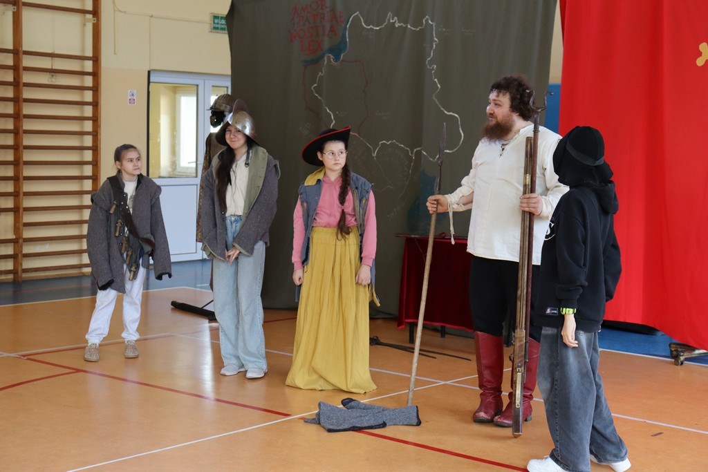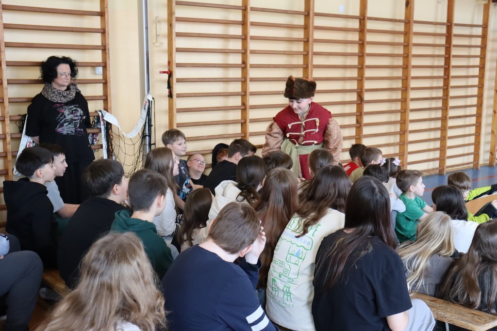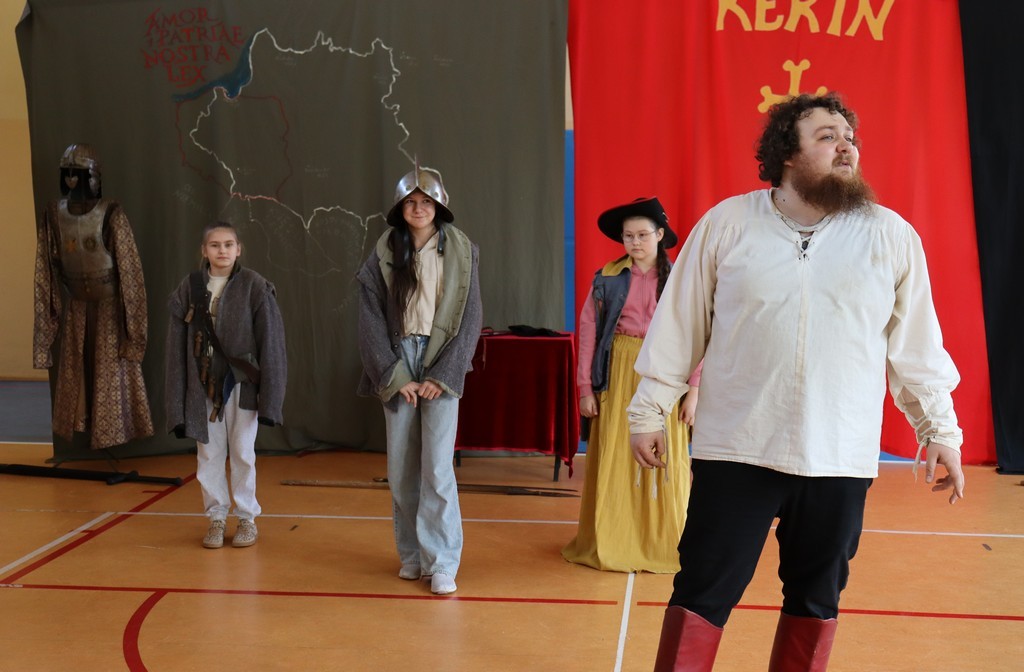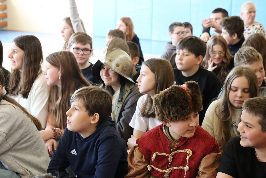 Dnia 2 marca 2026 roku uczniowie naszej szkoły uczestniczyli w żywej lekcji historii z Bractwem Rycerskim Kerin. Uczniowie mieli możliwość przenieść się w świat odważnych rycerzy, dowiedzieć się o obyczajach dworskich, które panowały w czasach średniowiecza. Młodzież szkolna z ogromnym zainteresowaniem słuchała ciekawych opowieści o szlachcie polskiej, o wiekach złotym i srebrnym w historii naszej Ojczyzny. Chętne osoby zakładały stroje historyczne z dawnych epok oraz próbowały posługiwać się bronią dawnych czasów.