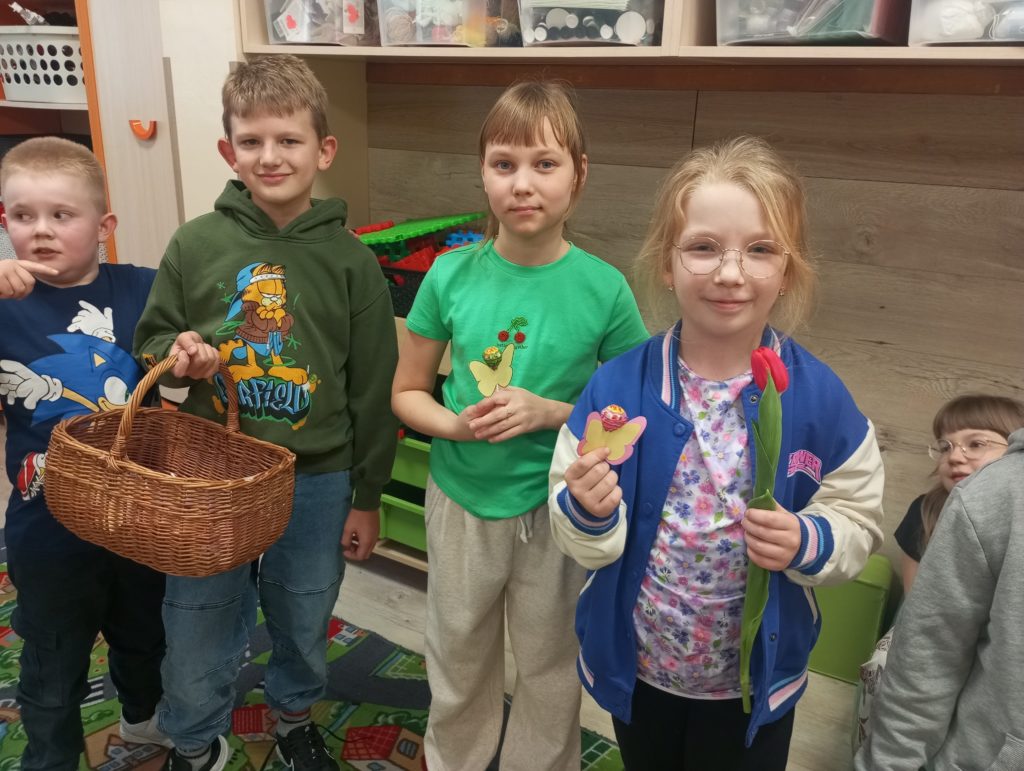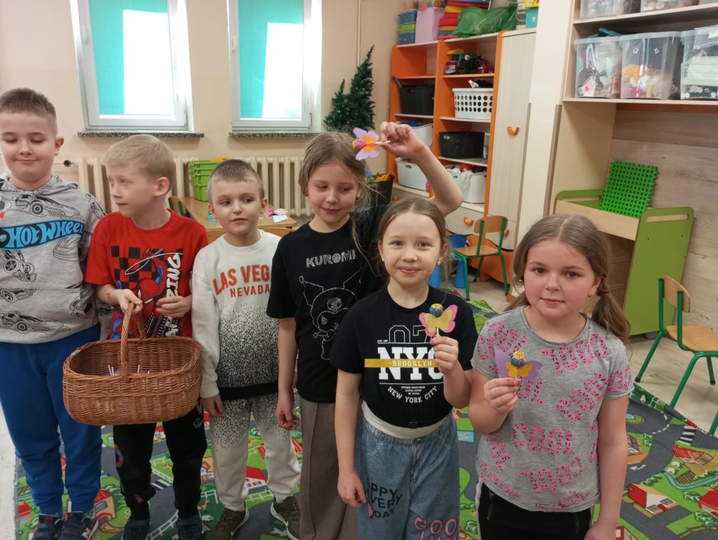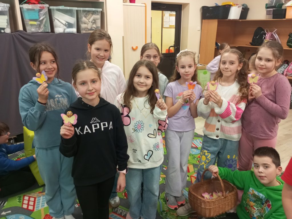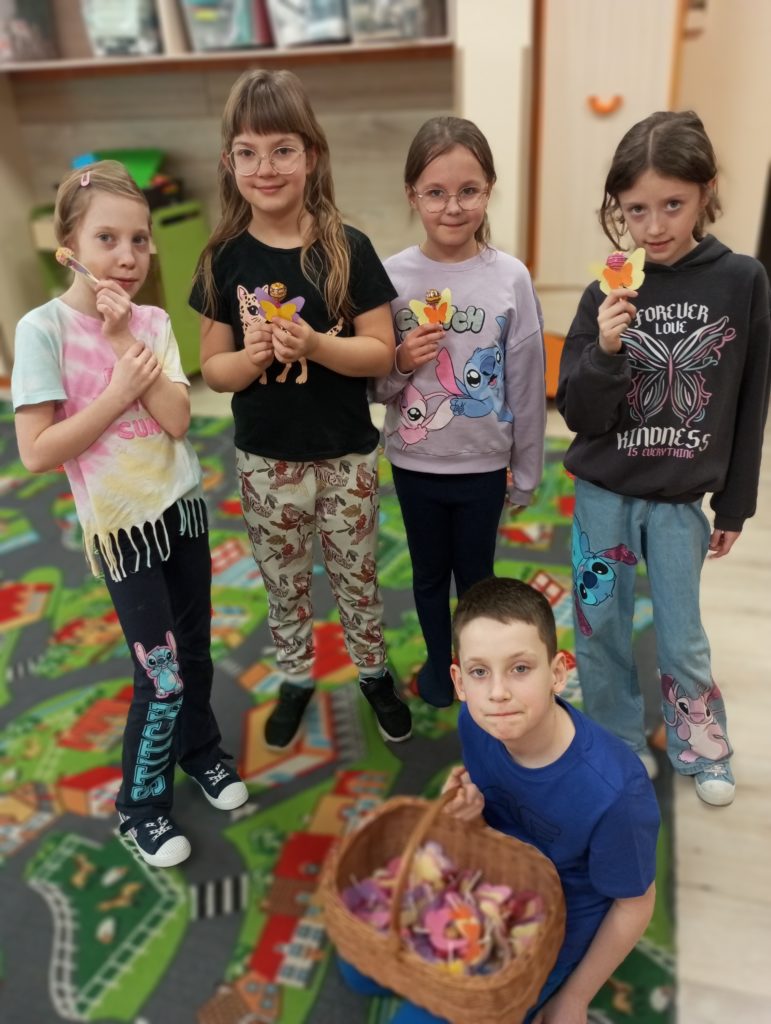 Z okazji Dnia Kobiet dzieci ze świetlicy szkolnej przygotowały wyjątkowe niespodzianki dla swoich koleżanek oraz kwiatki dla mam. Własnoręcznie wykonały słodkie upominki – kolorowe lizaki w kształcie motylków, które sprawiły wiele radości i wywołały uśmiechy na twarzach obdarowanych.