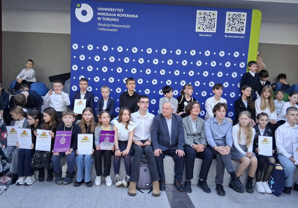 Na zdjęciu grupowym razem z dziećmi jest z prof. dr hab. Maciej Sysło, organizator konkursu.