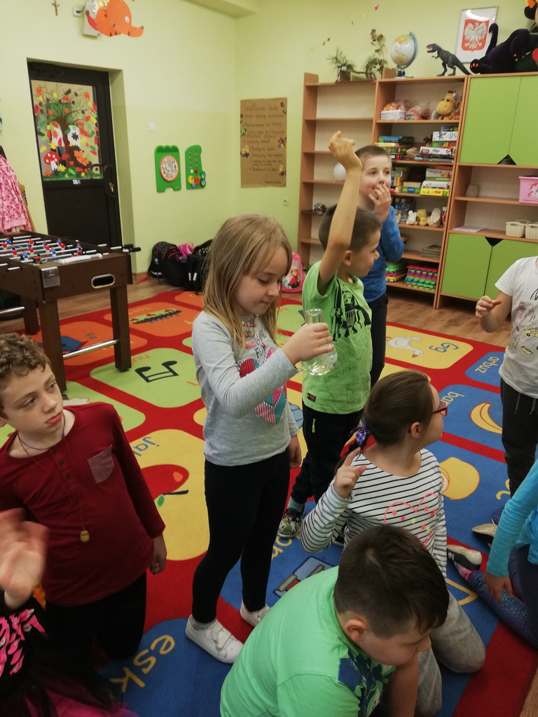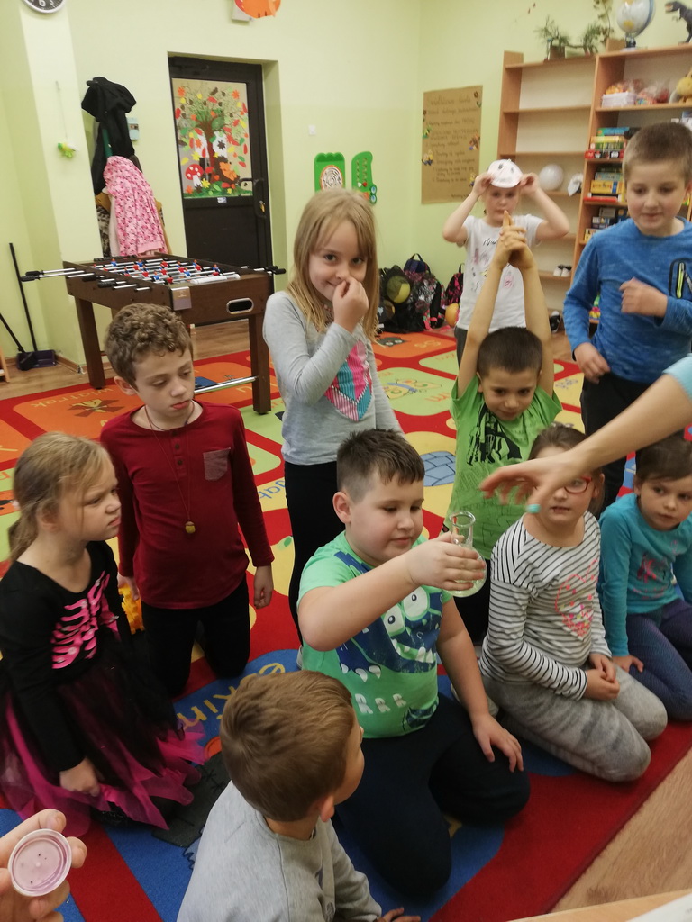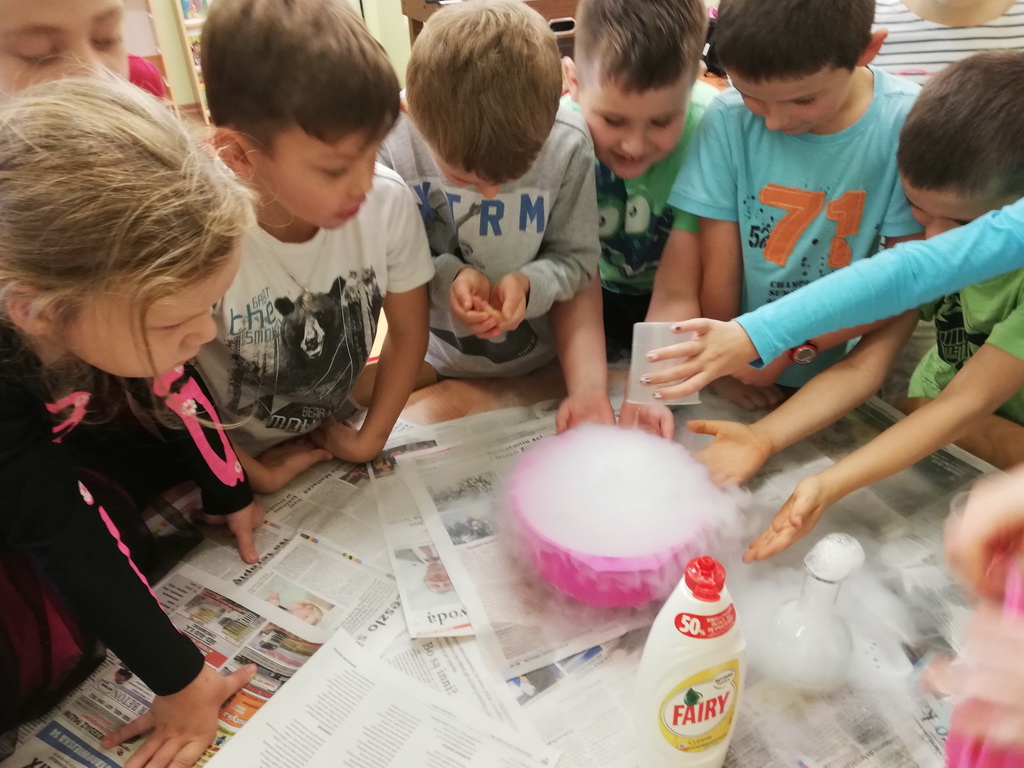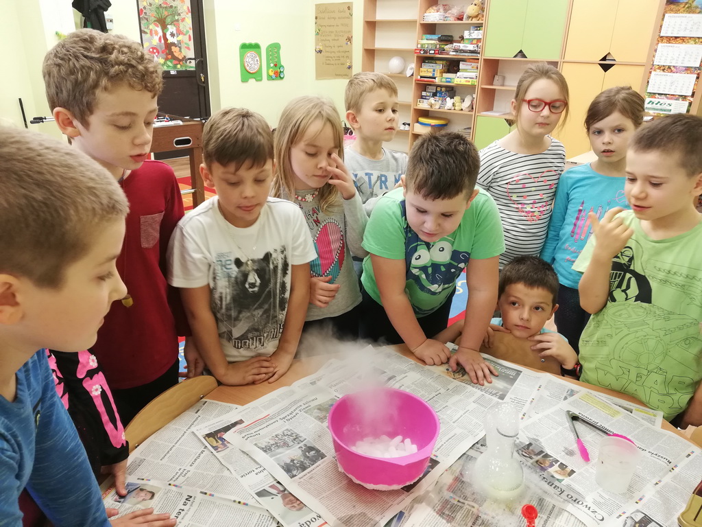 Na jednym z takich zajęć w świetlicy szkolnej uczniowie z klas pierwszych i drugich mogli zamienić się w naukowców, którzy uczestniczyli w zajęciach badawczych z wykorzystaniem suchego lodu.