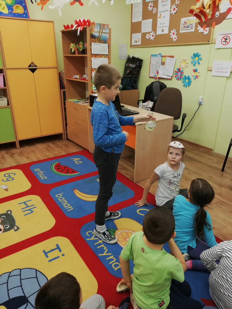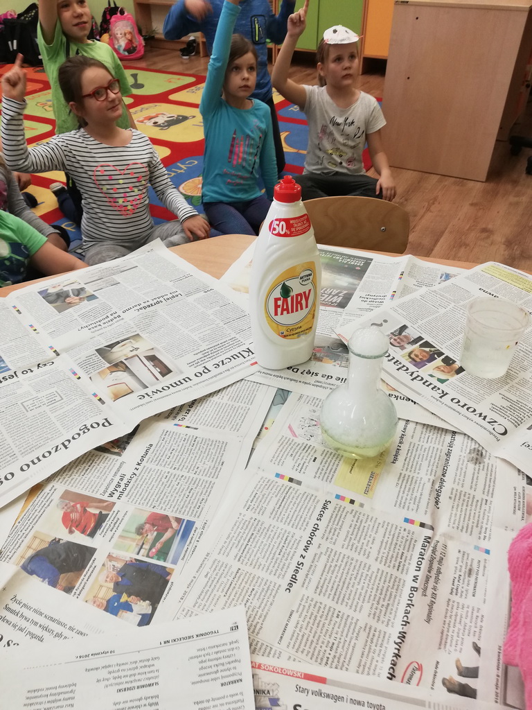 Eksperymenty z suchym lodem cieszyły się ogromnym zainteresowaniem wśród uczniów, szczególnie gdy unosiła się czarodziejska „mgła”. Dzieci były zaciekawione przebiegiem zajęć.