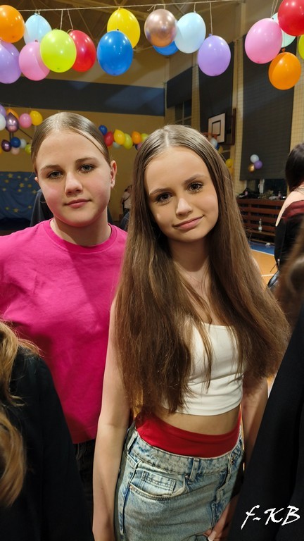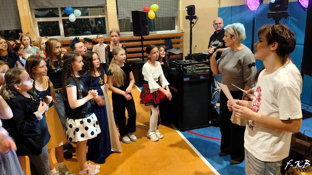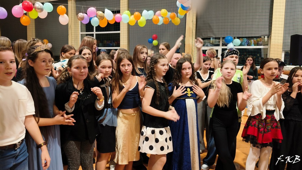 W dniu 13 lutego 2026r. sala gimnastyczna zmieniła się nie do poznania. Kolorowe balony, błyszczące serpentyny i profesjonalne oświetlenie stworzyły klimat prawdziwej sali balowej. Do tańca porwał nas znakomity DJ, zapewniając profesjonalną obsługę muzyczną. Wszyscy uczniowie bawili się wspaniale przy rytmach różnorodnej muzyki. Były pociągi, korowody, kółeczka, belgijka czy tańce w parach. Były też wspólne śpiewy i zabawy w kółeczku. Uczniowie klas 4-8 udowodnili, że ich wyobraźnia nie zna granic. Na parkiecie można było spotkać nie tylko klasyczne postacie z bajek, ale także superbohaterów, ikony popkultury, a nawet postacie z popularnych gier komputerowych. Nie zabrakło też eleganckich kreacji wieczorowych, które dodały imprezie szyku.